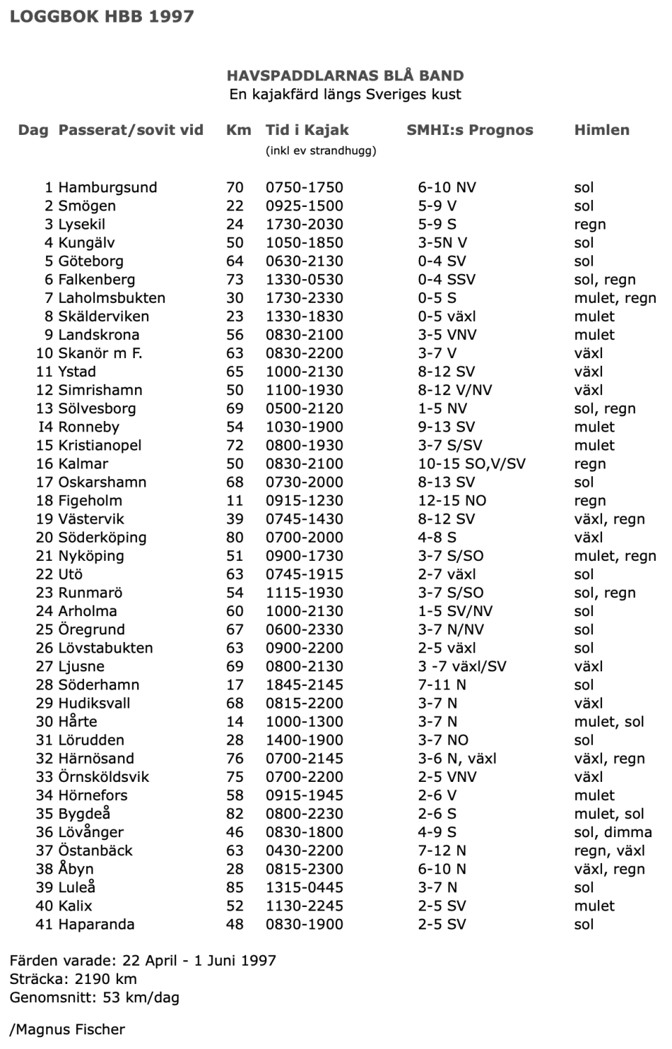 Själv tittade jag inte ens på mina kartor inför min HBB-paddling 1997, det enda jag gjorde var att numrera dem i kronologisk ordning. Att hitta matbutiker var inget större problem, de finns ju där det finns bebyggelse och det går att bedöma hyfsat när man tittar på kartorna. Min strategi har alltid varit att vara psykologiskt förberedd på alla möjliga och omöjliga händelser genom att fundera på hur jag skulle kunna lösa dem. Jag har också alltid lagt mycket tid på att välja utrustning. Och inte minst har jag paddlat mycket. Inför min HBB-start 22 april hade jag paddlat drygt 70 mil innevarande år.