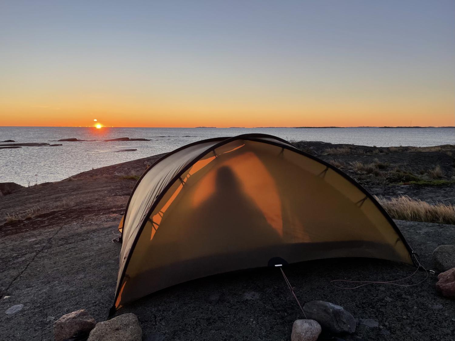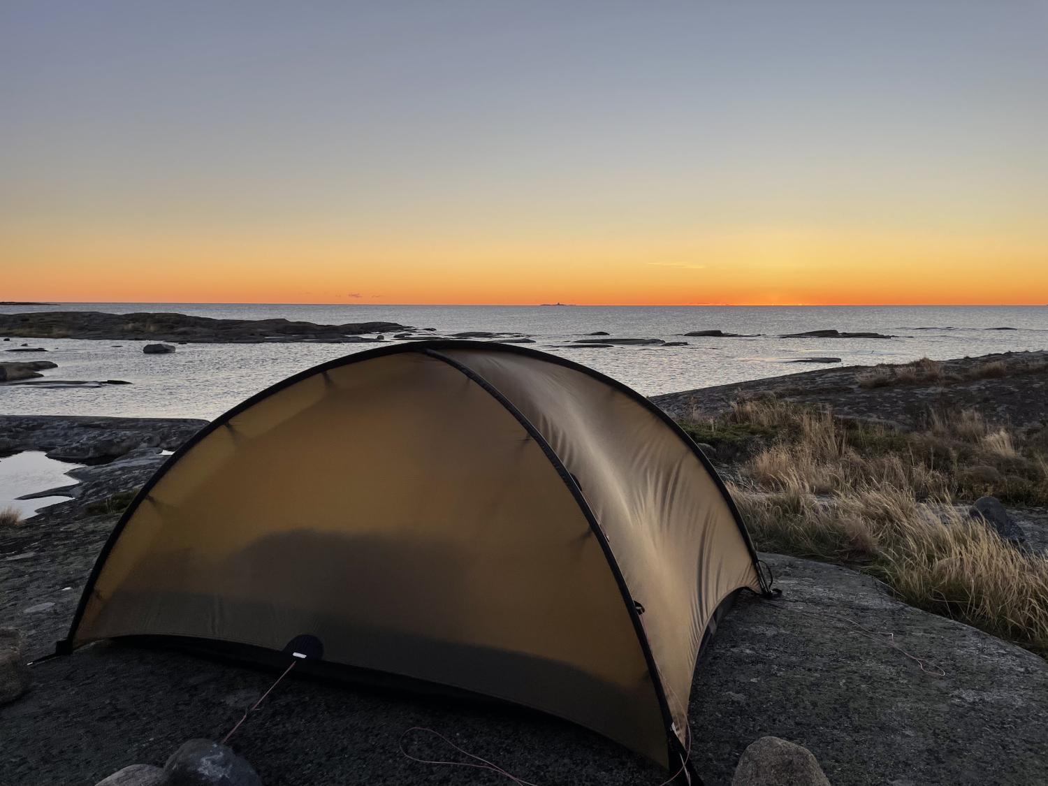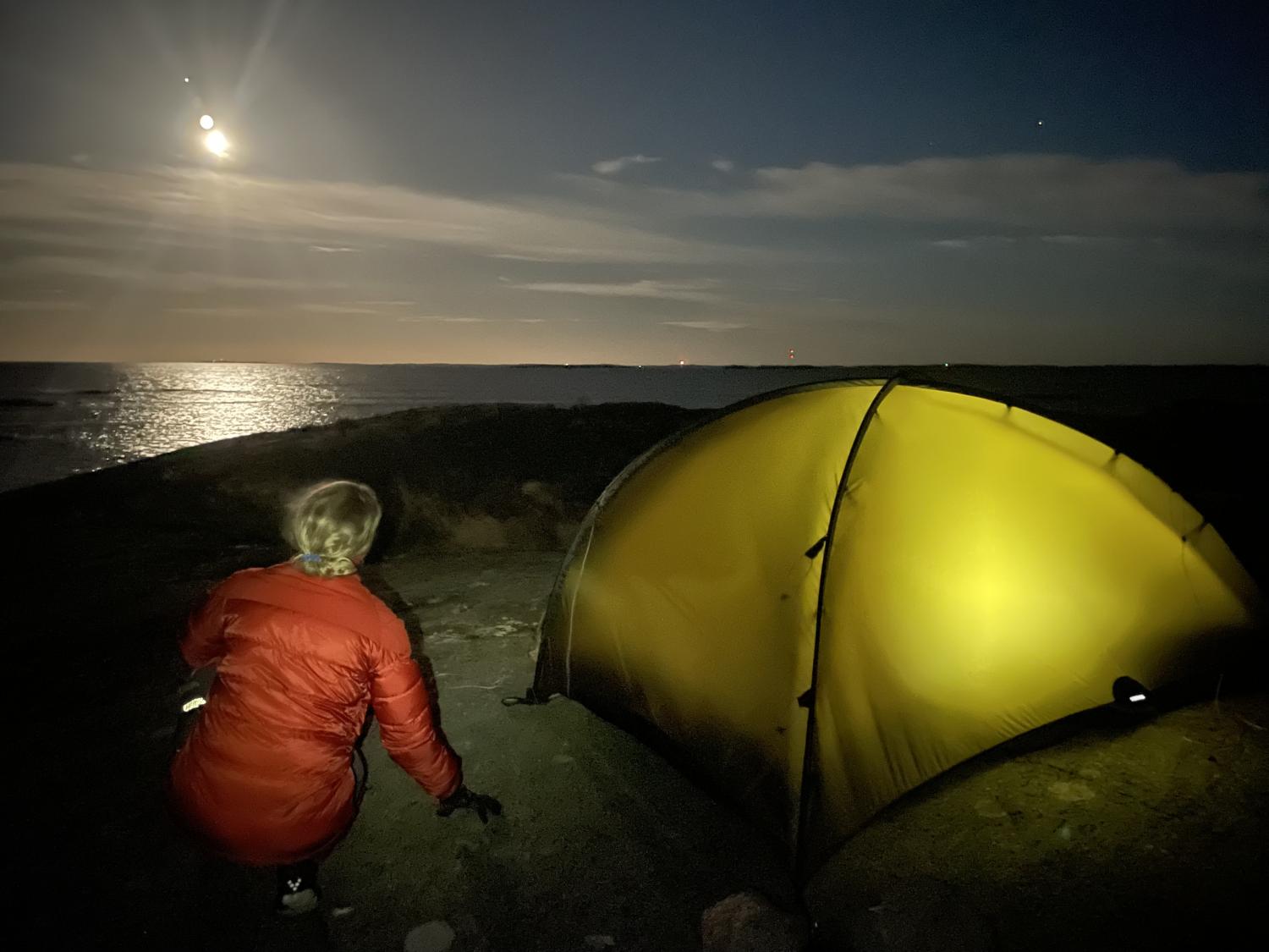 Söderarms fyr och några fartyg lyser långt bort. Stjärnhimlen är vacker, men vi äter middag i tältet eftersom vinden kyler utanför.