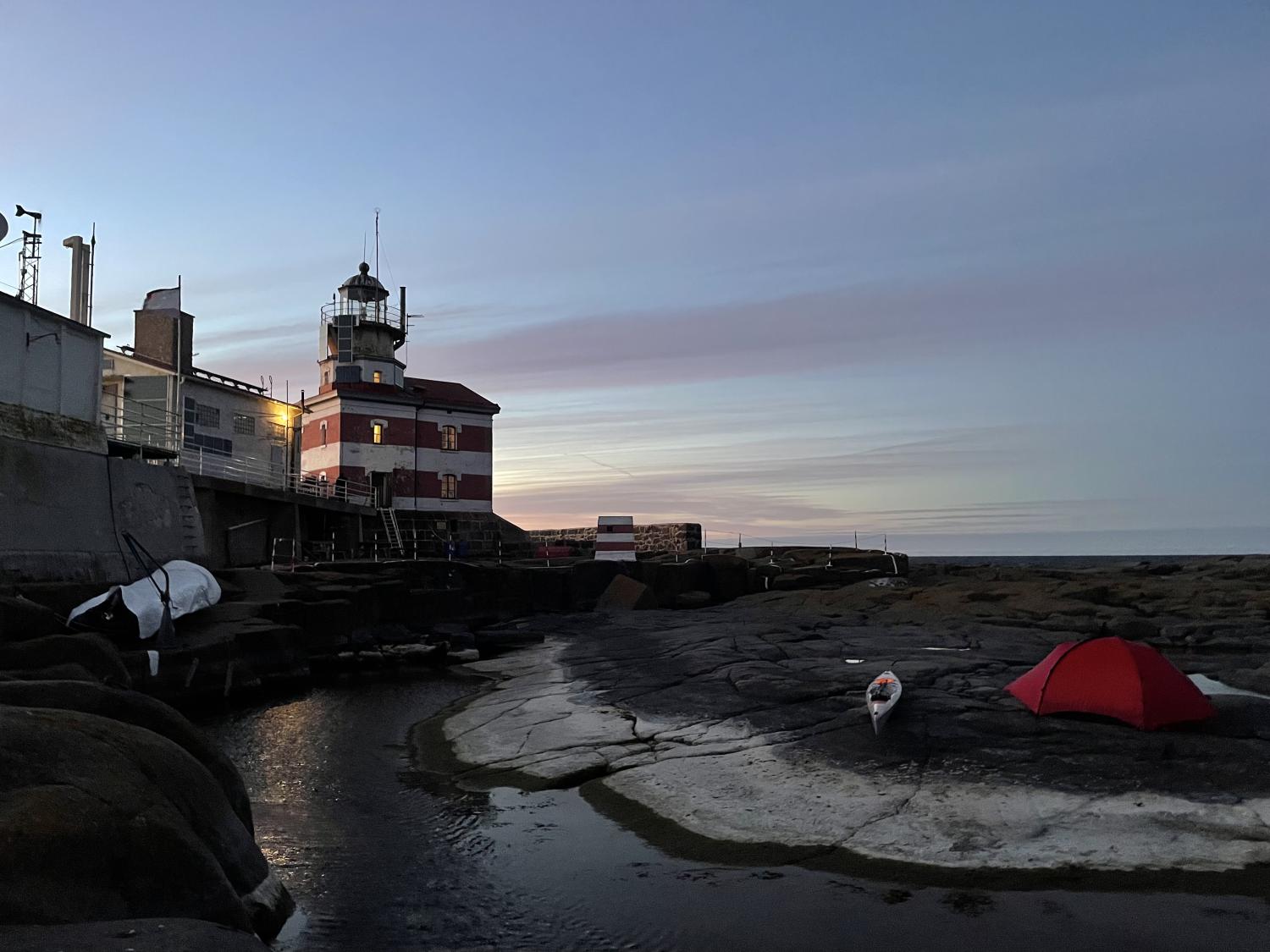 Sjösätter kl 18 och paddlar en timme. Sätter upp tältet på en liten ö några kilometer söder om den svenska fyren Understen. Med morgondagens prognos är detta en perfekt utgångspunkt för att surfa rakt ut i havet till den finska fyren Märket.
