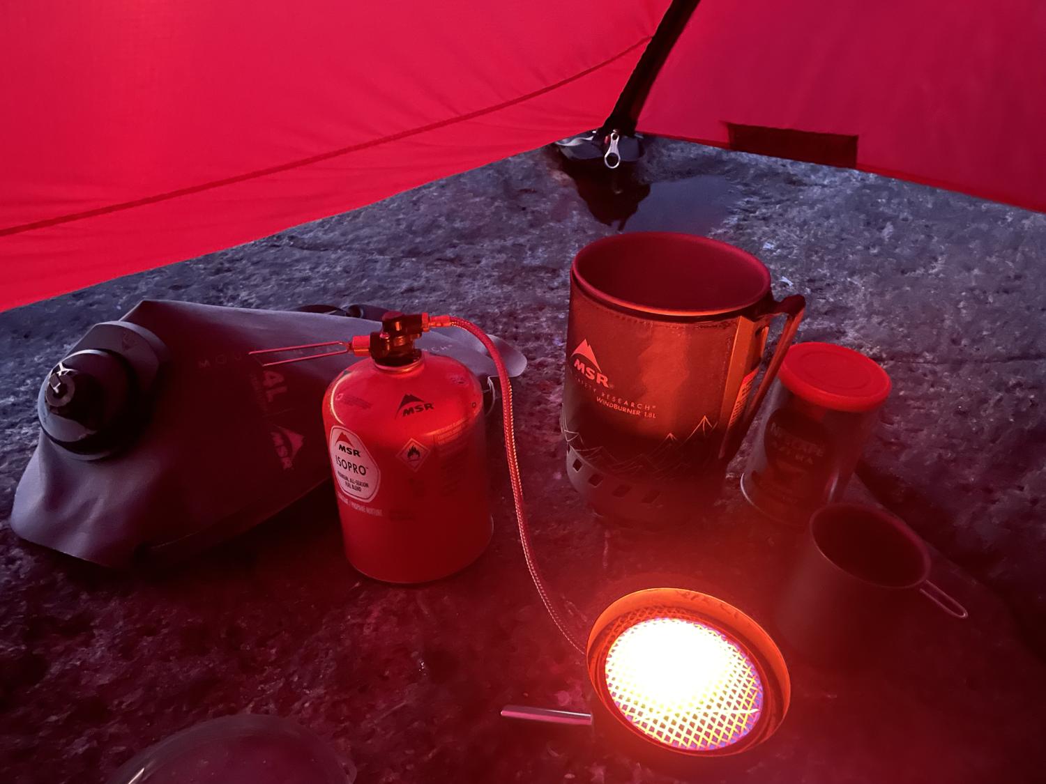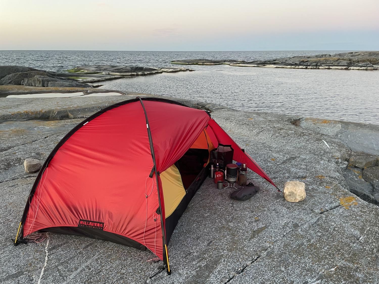 Jag sätter upp tältet för att äta och få bättre översikt över geografin och studera väderleksprognosen i lugn och ro med torr, varm och mätt kropp. Jag fattar bättre beslut då. Kloka beslut är avgörande här ute.