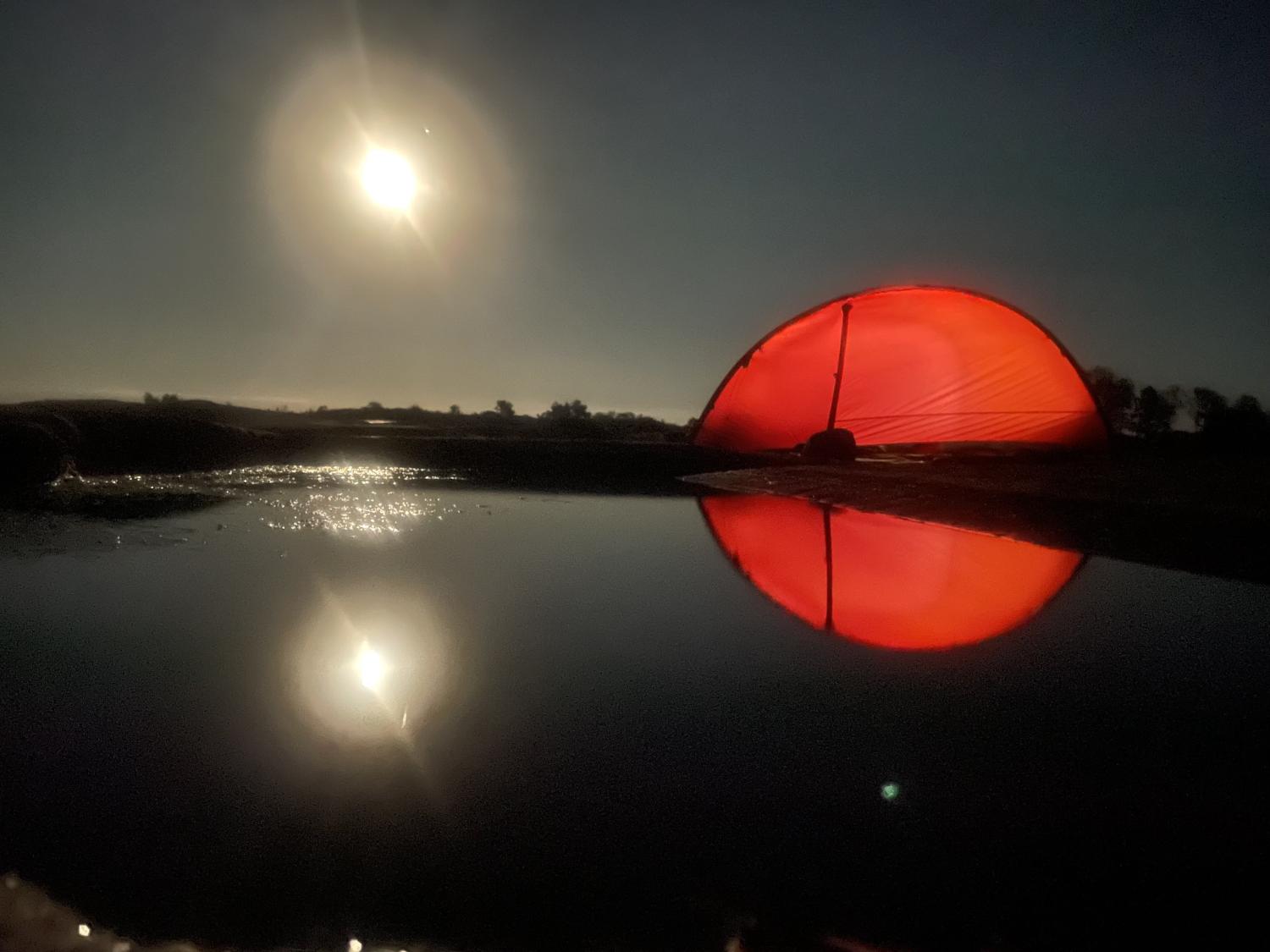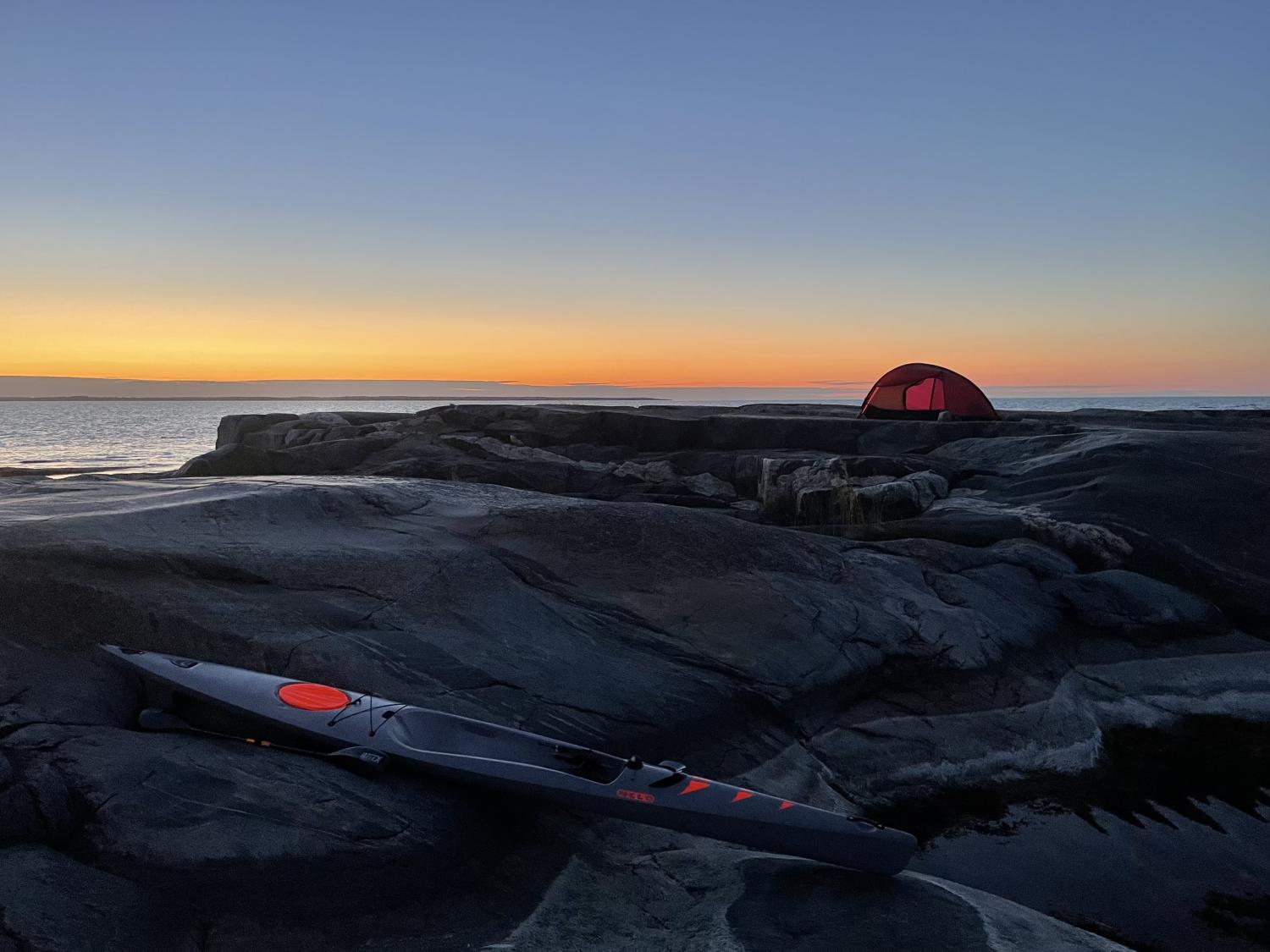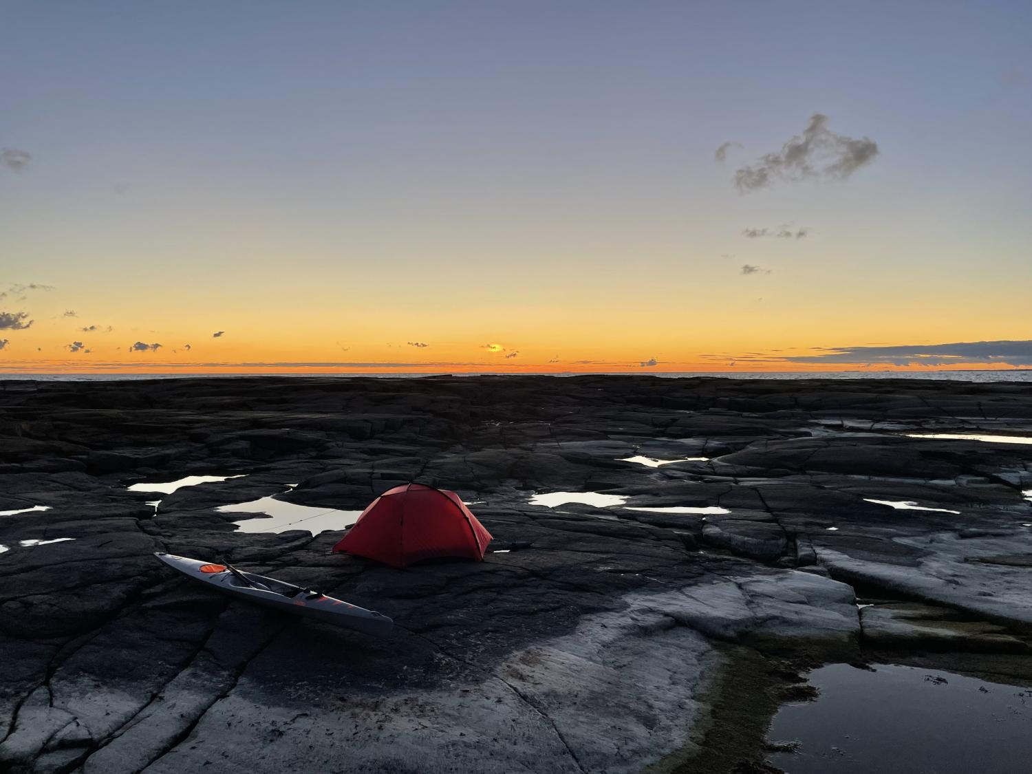 Paddlar ut till Håkanskär och sätter upp tältet. Återigen exploderar himlen tyst i alla nyanser mellan violett, gult, orange och rött.